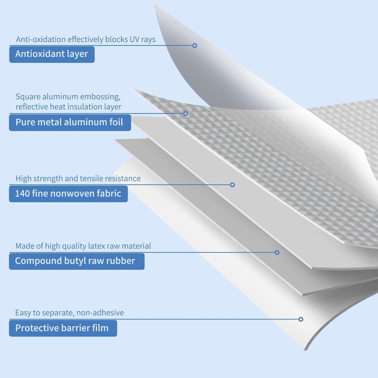 [SAFE & DURABLE]This super waterproof butyl seal duct tape is made of aluminum foil and butyl rubber. Butyl rubber is environmentally friendly material, and has a high viscosity. The small, square aluminum foil structure on the surface is abrasion-resistant and scratch-resistant. It also has a reflective and heat insulating effect. Don't have to worry about damage to the surface of the object from high temperatures.