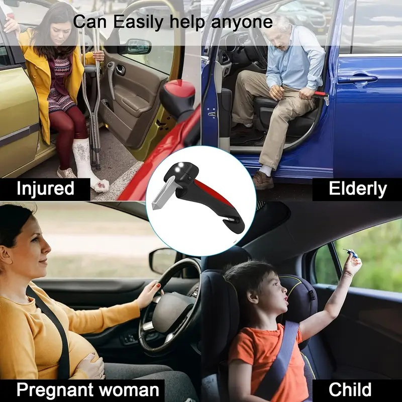 Portable LED Car Door Assist Handle with Seat Belt Cutter & Window BreakerEmergency Exit Aid for Elderly & Disabled – Vehicle Safety Essential Safe, Independent Car Entry/Exit + Emergency PreparednessThis aircraft-grade aluminum assist handle combines mobility support and life-saving tools in one compact device. The LED-lit grip provides stability for seniors/disabled users, while integrated seat belt cutter and window breaker ensure emergency readiness. ��️ Key Features:✔ Dual-Function Design: Ergonomic Assist Handle – Supports up to 330 lbs (150kg) Emergency Tools – Tungsten-tipped window breaker & razor-sharp belt cutter ✔ High-Visibility LED Light – 3 modes (steady/flash/SOS) with USB rechargeable battery✔ Aircraft Aluminum – 50% lighter than steel, rust-proof✔ Non-Slip Red Grip – Soft TPR coating for wet/gloved hands✔ Universal Fit – Clips onto any car door frame (sedans/SUVs/trucks)