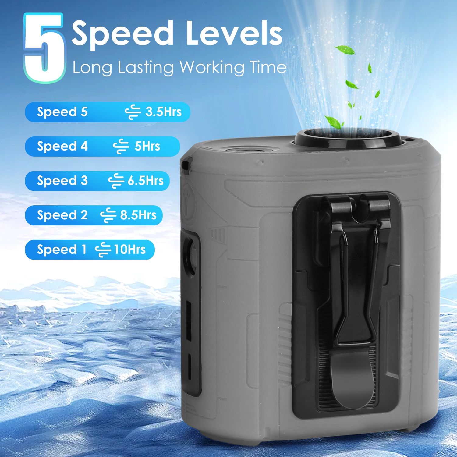 *5 Levels Strong Airflow*:Adopts high-efficiency turbo brushless motor that delivers up to 13000RPM rotating speed,this rechargeable waist clip fan provides 5 levels of wind speeds,from refreshing to strong,one-button control easily adjusts the settings to suit personal preferences. Perfectly suitable for workers who need strong wind in high-temperature environments.