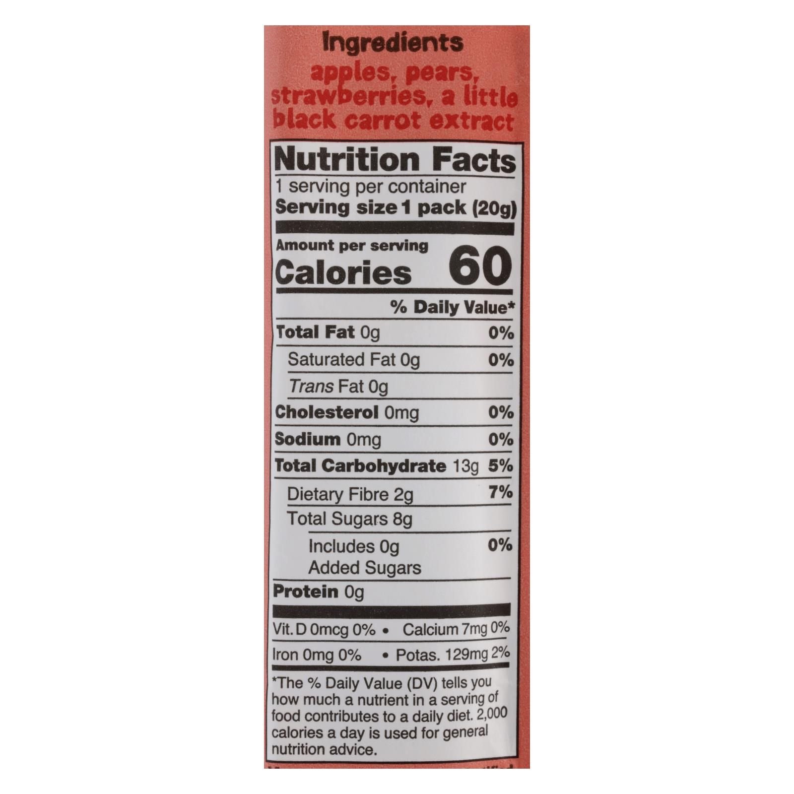 Bear fruit roll multi strawberry are perfect for snacking children or snackers of any age who want a well made, mouth-watering fruity flavored snack. These fruity roll ups have no added sugar, one cup of fruit per pack, and no concentrates, fillers or other nonsense. What you will find are apples, pears, strawberries and black carrot extract. They are non-gmo, vegan, kosher, and gluten-free. Each box contains five 0.7 oz. Or 20 g. Packs. See nutrition facts panel for allergens. Send packs with your kids to school. They'll love these fruity yoyos.