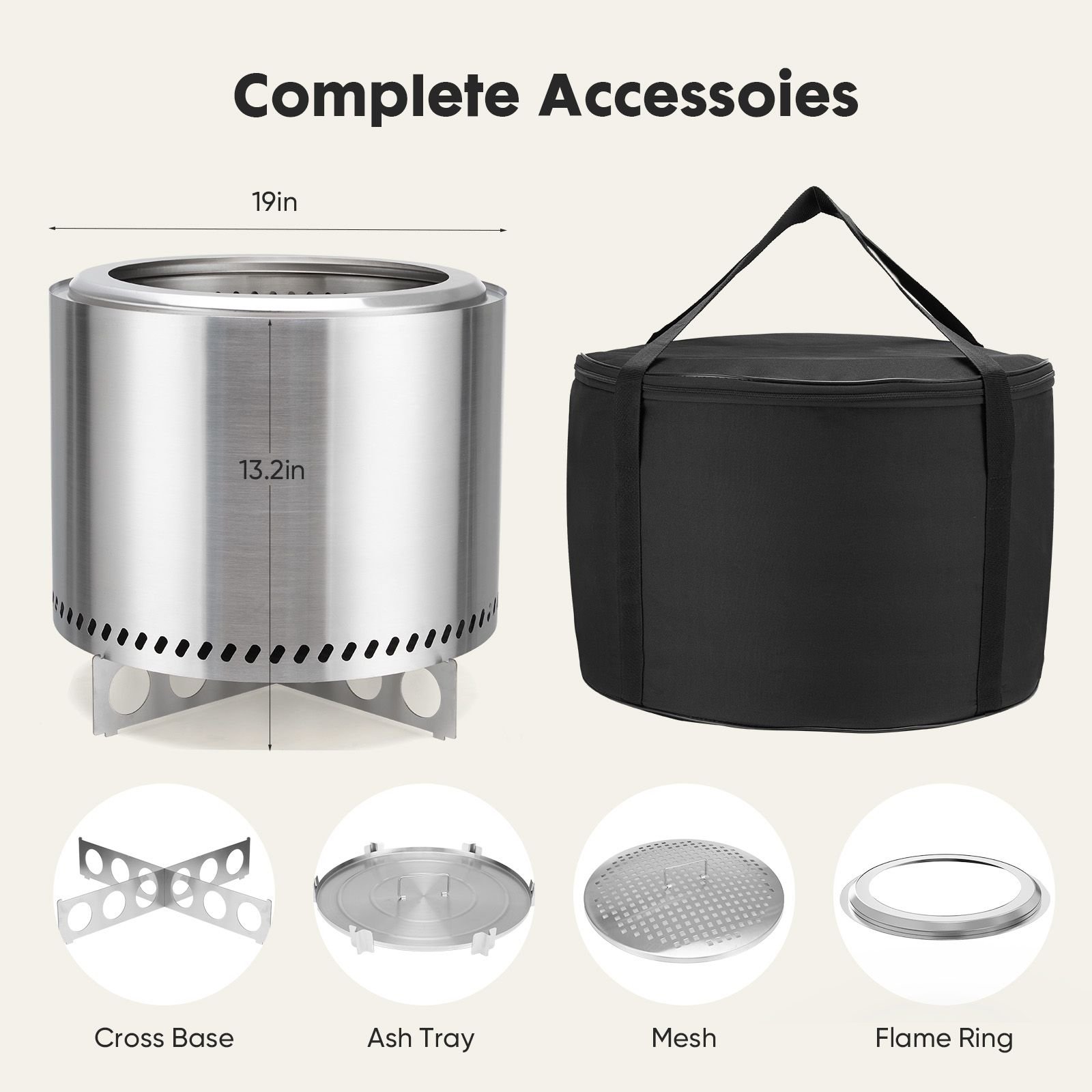 Portable Outdoor Firepit:This smokeless wood/pellets burning stainless steel fire pit is your gateway to hassle-free outdoor enjoyment anywhere you go. Ideal for patios, backyards, balconies, camping trips, RVs, or tailgates, it's designed for convenience and portability. The compact size (19" x19") and included carrying bag make it easy to transport and set up wherever you are.