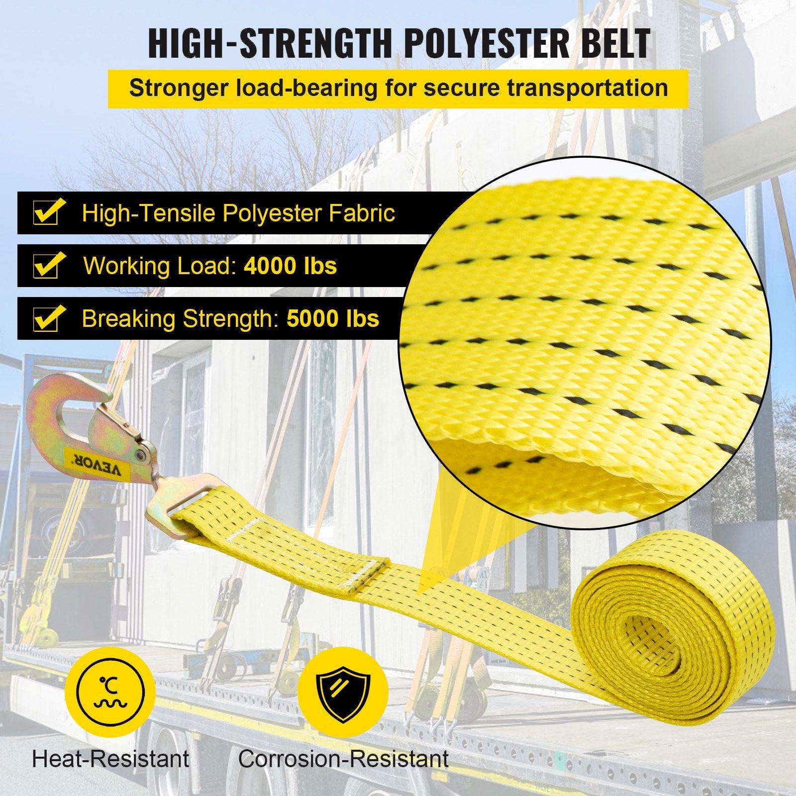 2.4000 lbs Working Load: This strap has a safe working load of 4000 pounds (1.81 ton) and a breaking strength of 5000 pounds (2.27 ton). It is a good helper for bundling and transporting large cargo.