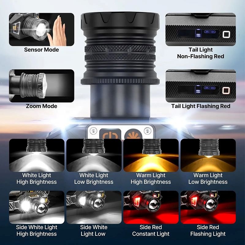 Lighting mode: 5 gears (Main light: super bright / medium bright / flashing. Side lights modes: super bright / red and blue flashing)