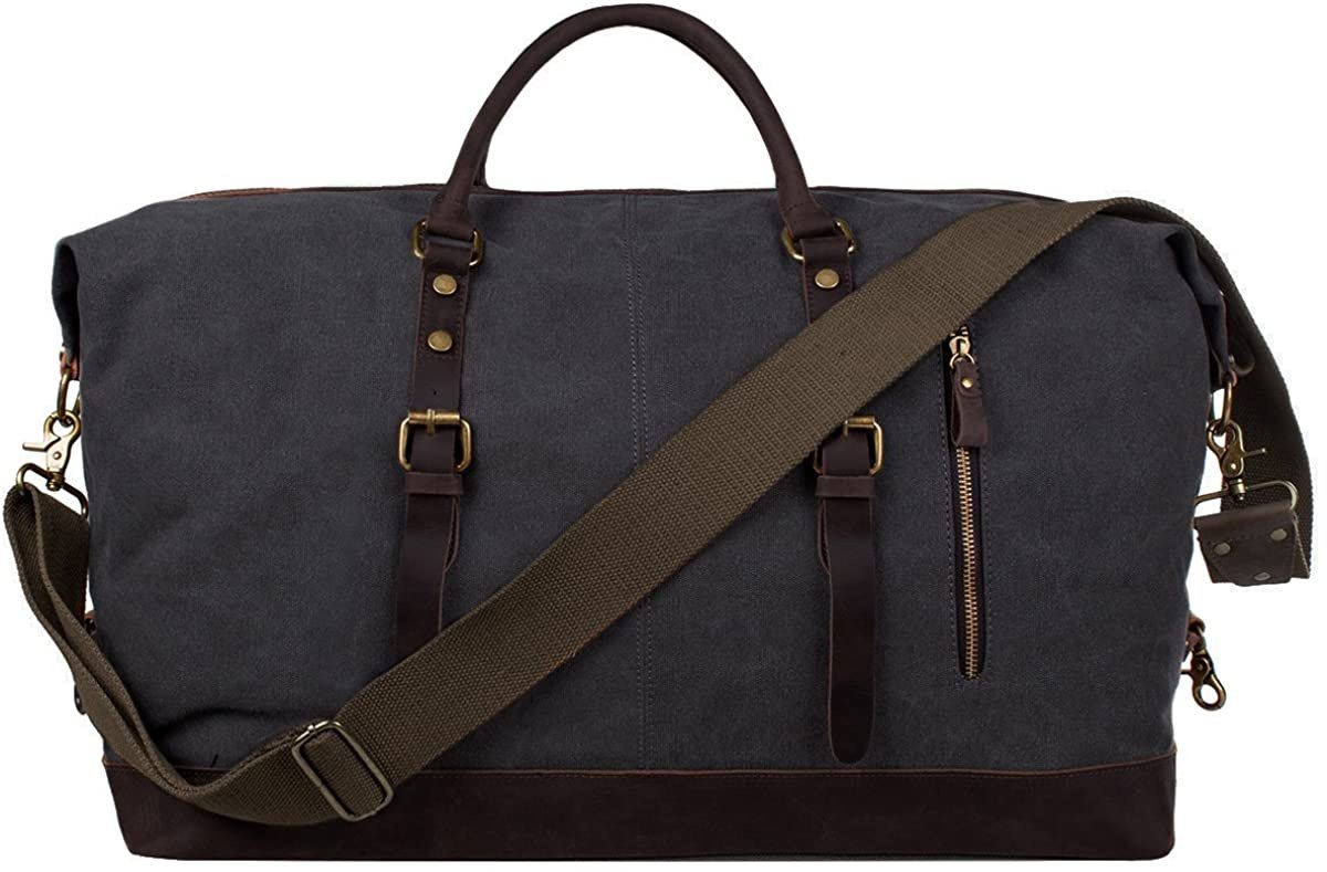 S-ZONE Duffle Bag for Travel 60L Canvas Duffel Bag Carry on Genuine Leather Overnight Weekender Bag for Men