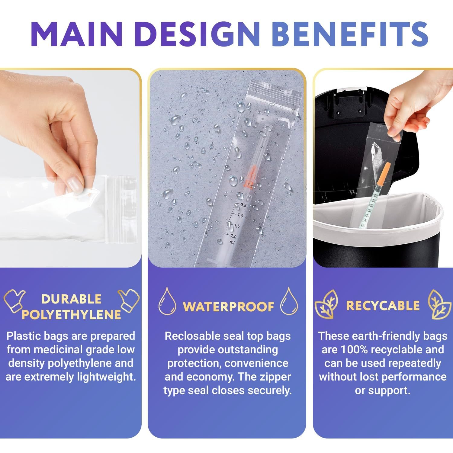 2.High quality. Plastic bags are prepared from medicinal grade low density polyethylene and are extremely lightweight. You can ensure that your syringe delivery and handling will work perfectly with the use of syringe reusable bags. These reclosable bags are easy to seal multiple times and therefore ideal for keeping the syringes during the course of a treatment. The medicinal grade clear durable bags are really the product to have when you have to administer nutrient delivery to several patients.