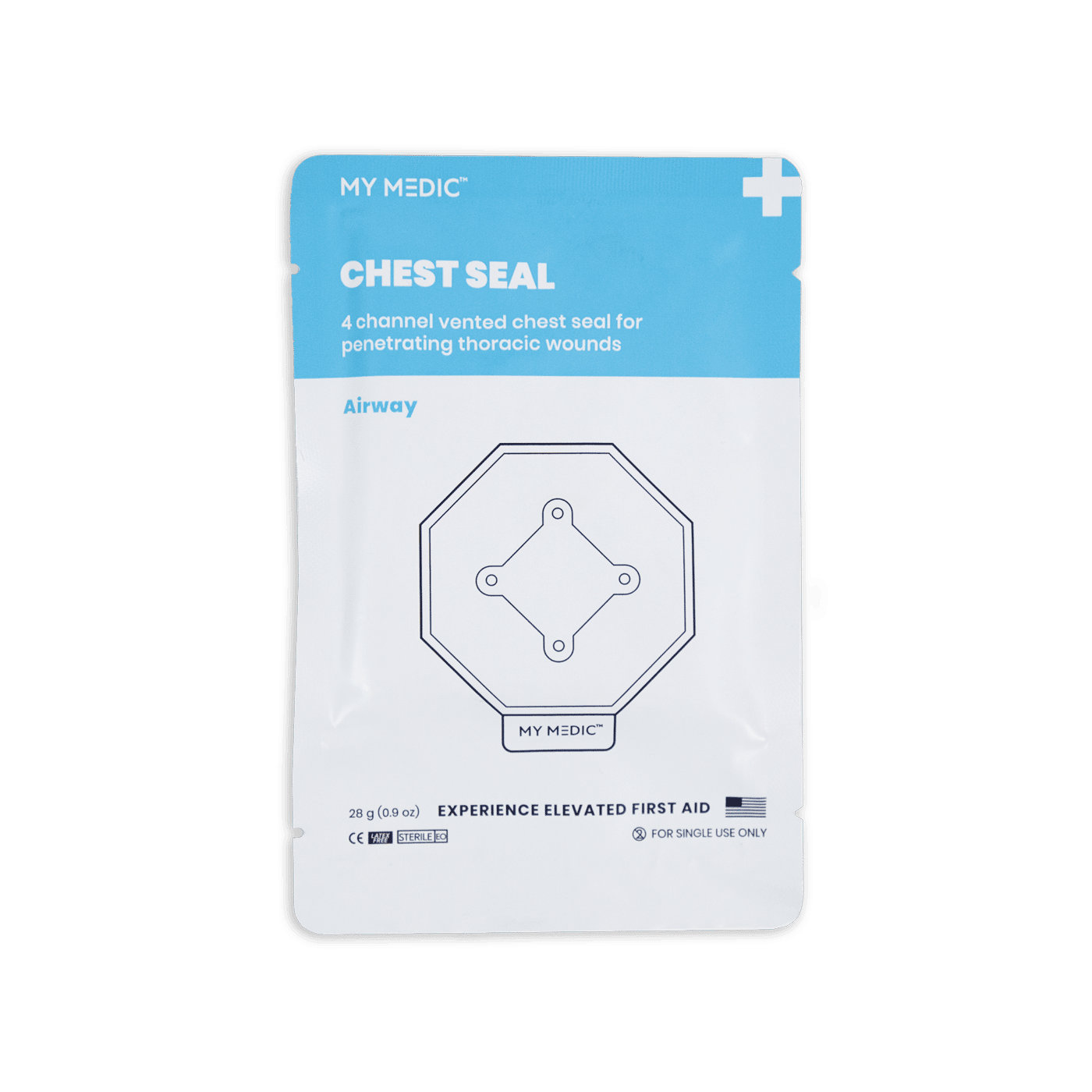 Designed for the management and treatment of an open and/or tension pneumothorax which may have been caused by a penetrating chest trauma. The innovative feature of these chest seals uses 4-vented channels which allow air to escape the chest cavity during exhalation but prevent airflow from entering through the injury site during inhalation. Advanced adhesive designed to overcome obstacles, such as blood, sweat, dirt, and other contaminants.