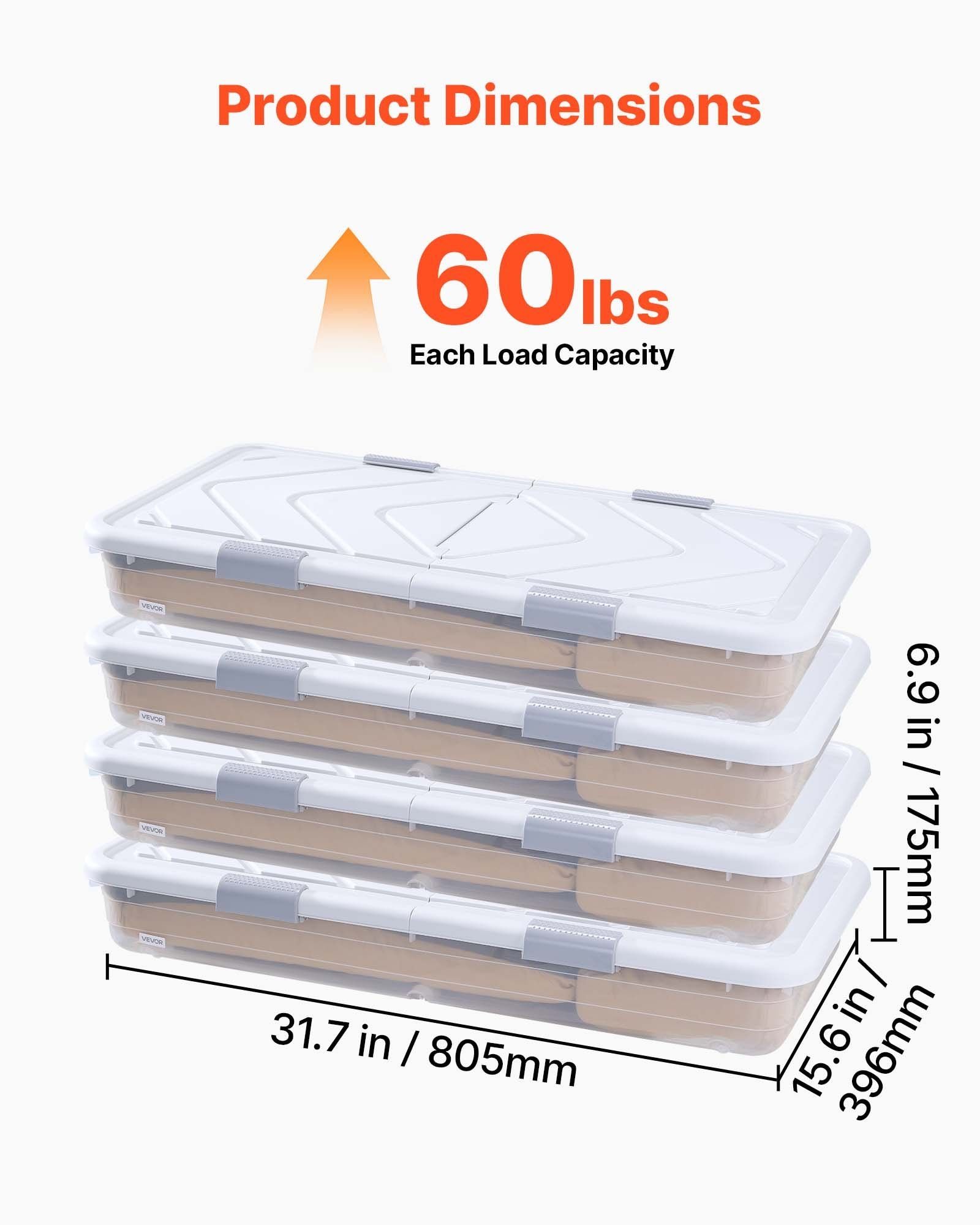 1.Extra Large Capacity: This under bed storage measures 31.7 x 15.6 x 6.9 inches and supports up to 32.6 lbs. Designed to fit under standard beds, three units can be stacked vertically. Its spacious capacity holds shoes, toys, clothes, books, and other heavy items. Sturdy, stable, and durable